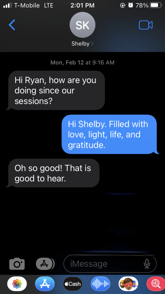 But for this first post, I will share this image of a text conversation from February with a Spirit Guide/Energy Healer/good friend named Shelby Kushma. I share this because I didn’t think I would ever feel this way: